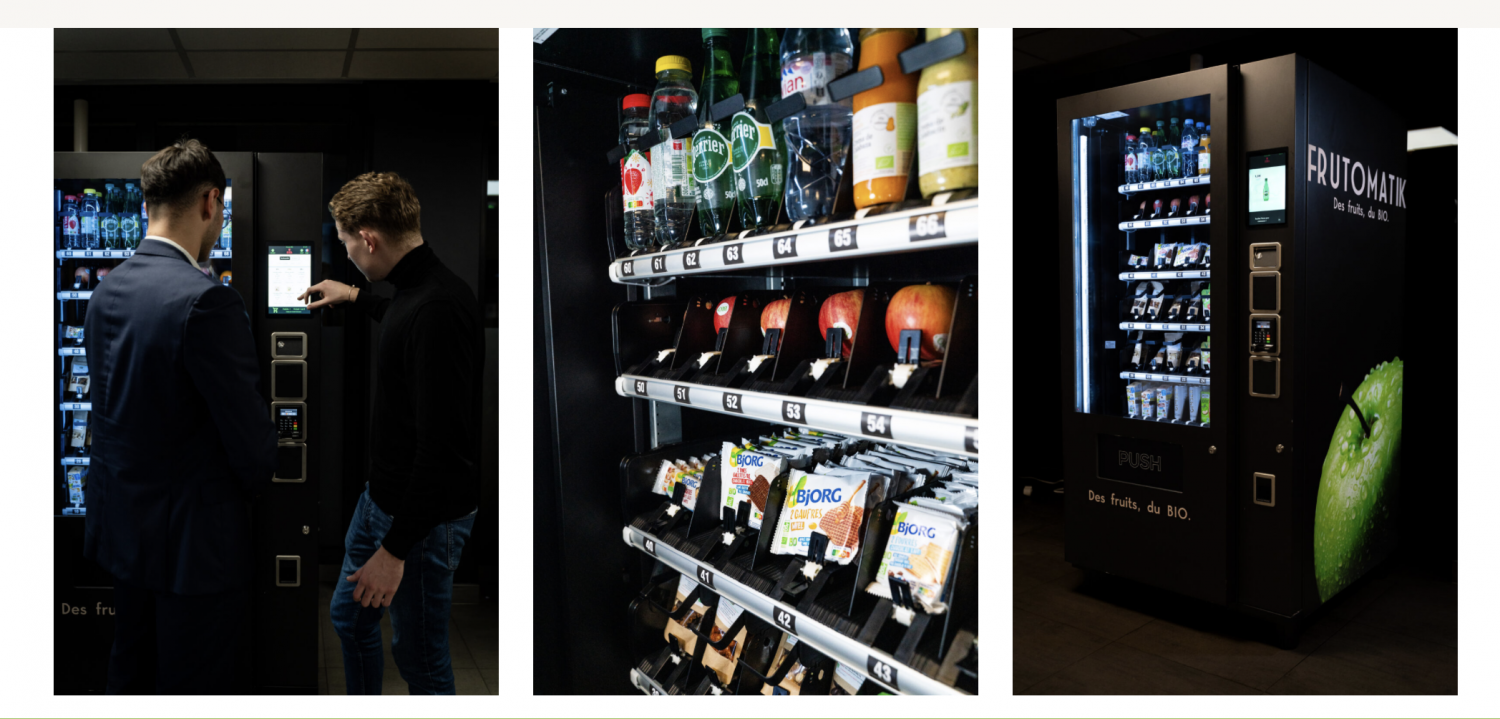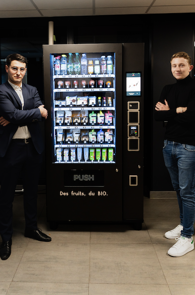 C’est lors d’un épisode de canicule qu’Adrien Toussaint et Théo Morin tous deux étudiants en école de commerce ont eu de pouvoir consommer un fruit frais au distributeur à proximité de la salle de cours. Une logique qui leur a paru à la fois naturelle et porteuse. Après avoir un peu plus « creusé » le sujet ces derniers élargissent leur approche autour d’un distributeur automatique au contenu repensé à savoir contenant des fruits mais également des produits sains/BIO à base de fruits.