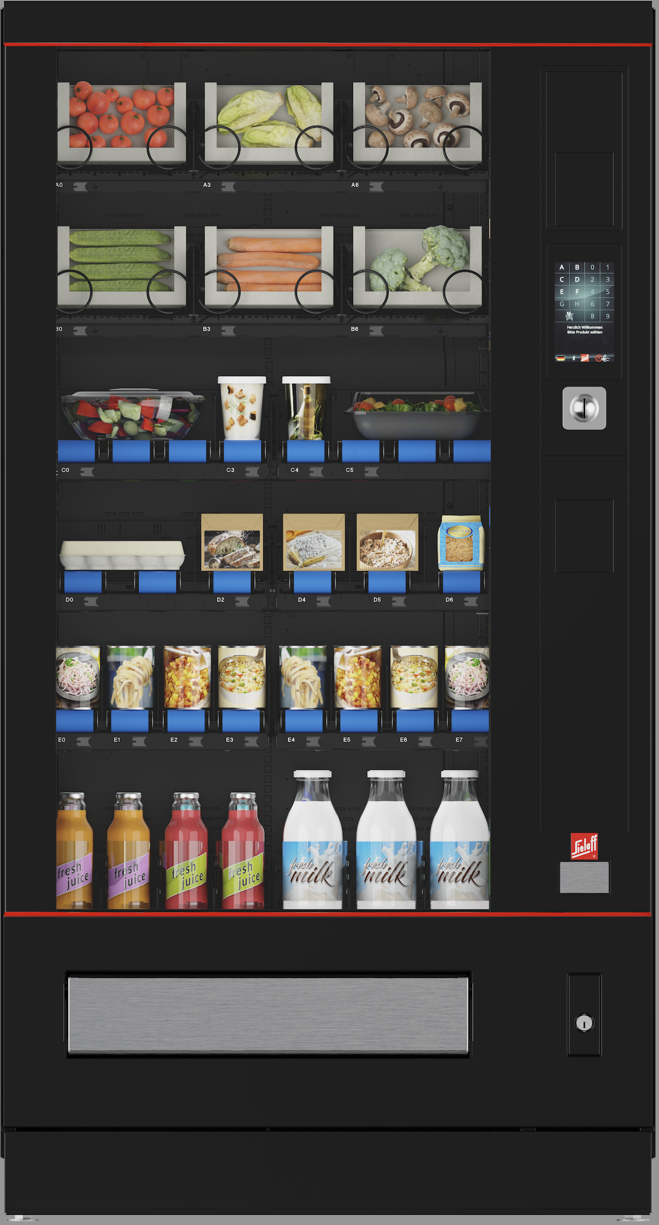 Avec jusqu’à deux plages de température différentes, l’intérieur est toujours refroidi de manière optimale en fonction des produits. Pour la vente de denrées alimentaires fraîches, les distributeurs de la série SiLine® sont disponibles, outre la version standard pour snacks, en variante « LM » et en version à deux températures « 2 T ». Le « logiciel de sécurité alimentaire »intégré surveille en permanence la température dans la zone LM et garantit que seuls des produits parfaitement réfrigérés sont distribués. La position de la séparation thermique entre les niveaux peut être adaptée de manière flexible à la configuration souhaitée. Les distributeurs automatiques peuvent également être configurés avec une gamme exclusivement composée de boissons, ainsi qu’en version LM pour les smoothies ou les boissons lactées fraîches. Les contenants sont stockés debout dans des compartiments à glissière.